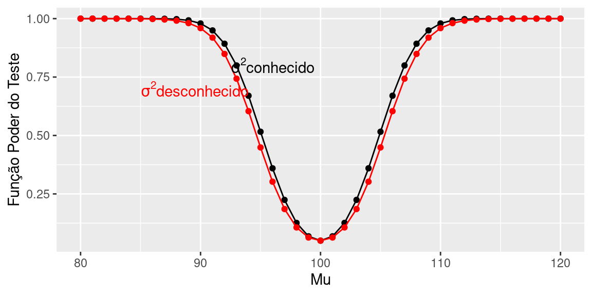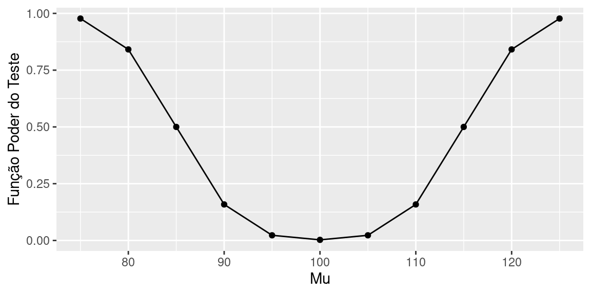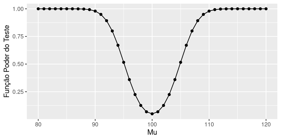 Observe que, para \(\mu=100\), valor da hipótese nula, a função poder é igual à probabilidade do erro tipo I (nível de significância).