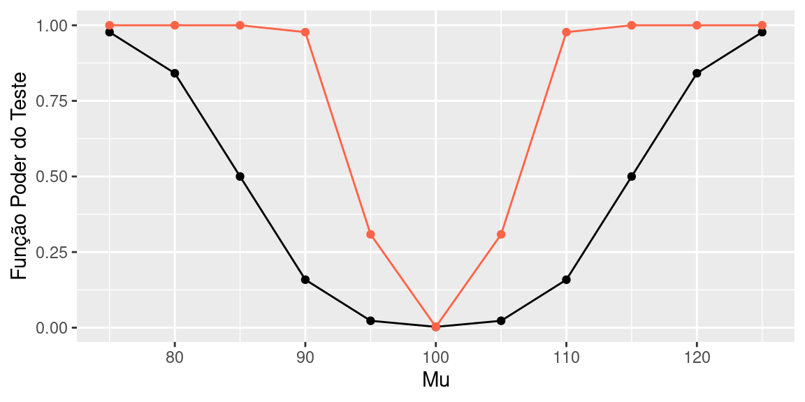 Note que o poder do teste baseado em uma amostra de tamanho 100 é sempre maior que o poder do teste baseado em uma amostra de tamanho 16.