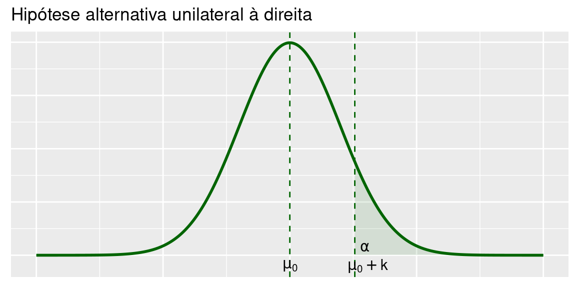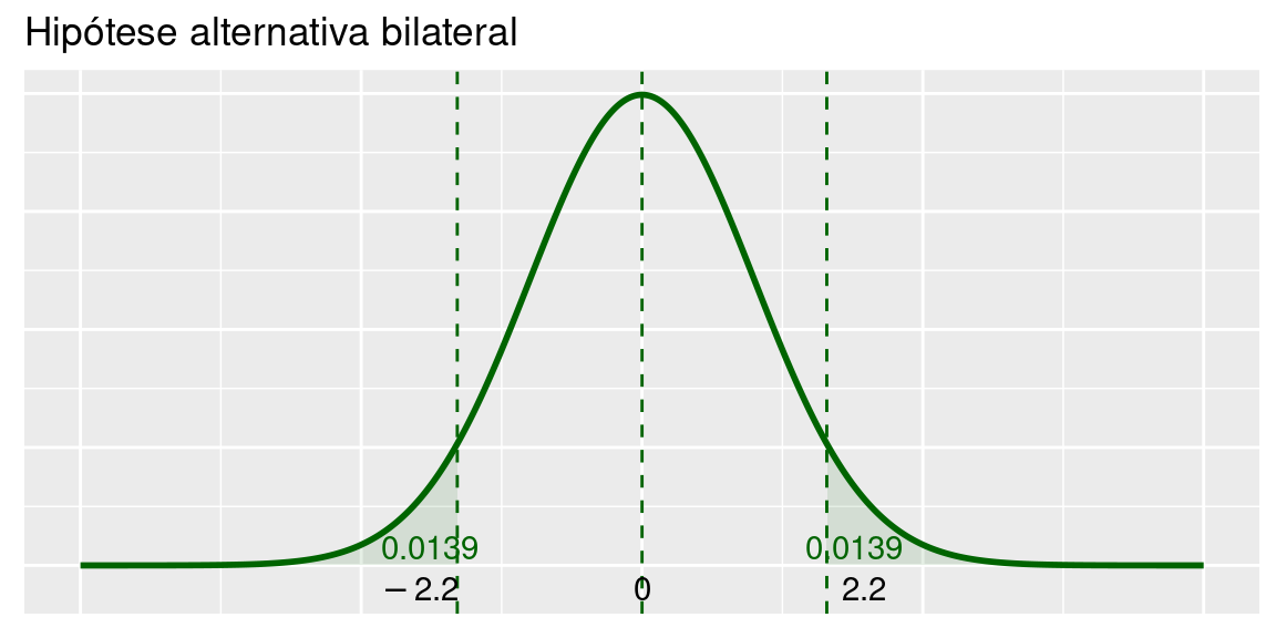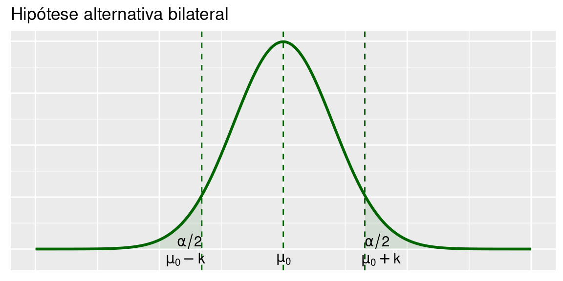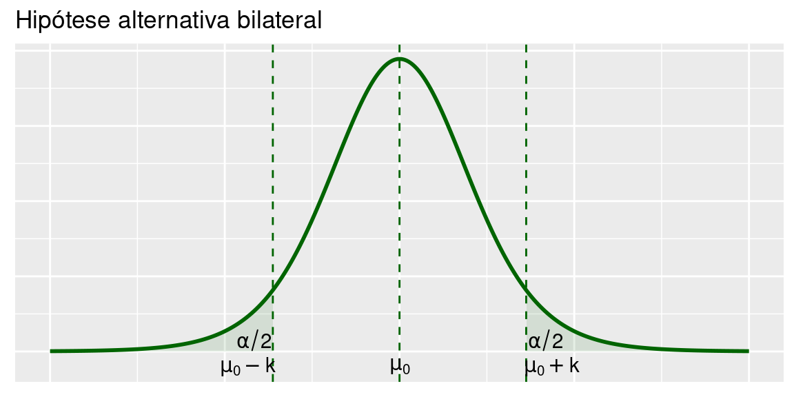 A hipótese alternativa, representada por \(H_1\), é a hipótese que devemos considerar no caso de rejeição da hipótese nula. A forma mais geral de \(H_1\) é a hipótese bilateral